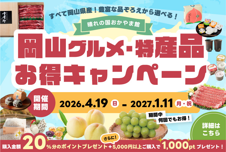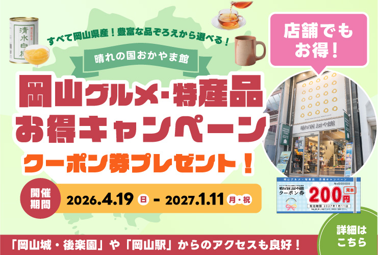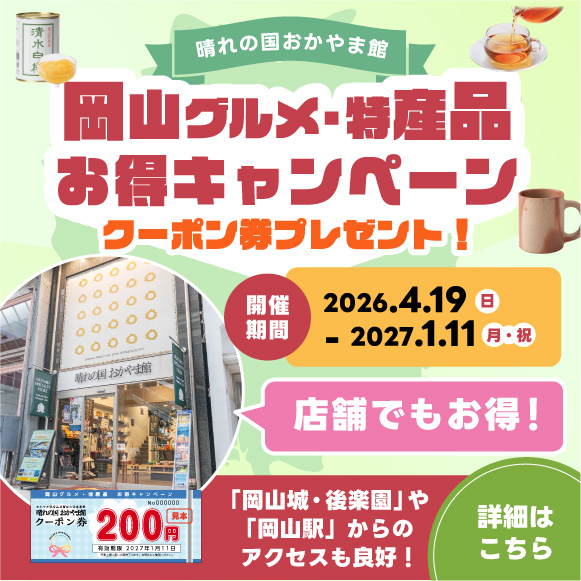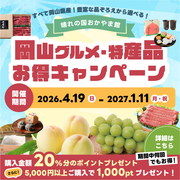 また、キャンペーン終了後も引き続き皆様に岡山県産品のお買い物をお楽しみいただける企画や特集を随時開催予定でございますのでどうぞご期待ください。引き続き、末永く「晴れの国おかやま館オンラインショップ」をどうぞよろしくお願いします。
